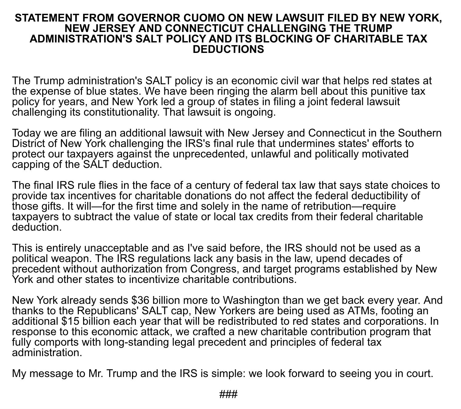 Archive Governor Andrew Cuomo On Twitter Breaking New York Just Filed A Joint Lawsuit With N J And Connecticut Challenging The Trump Administration S Politically Motivated Salt Policy And Its Blocking Of Charitable Tax
